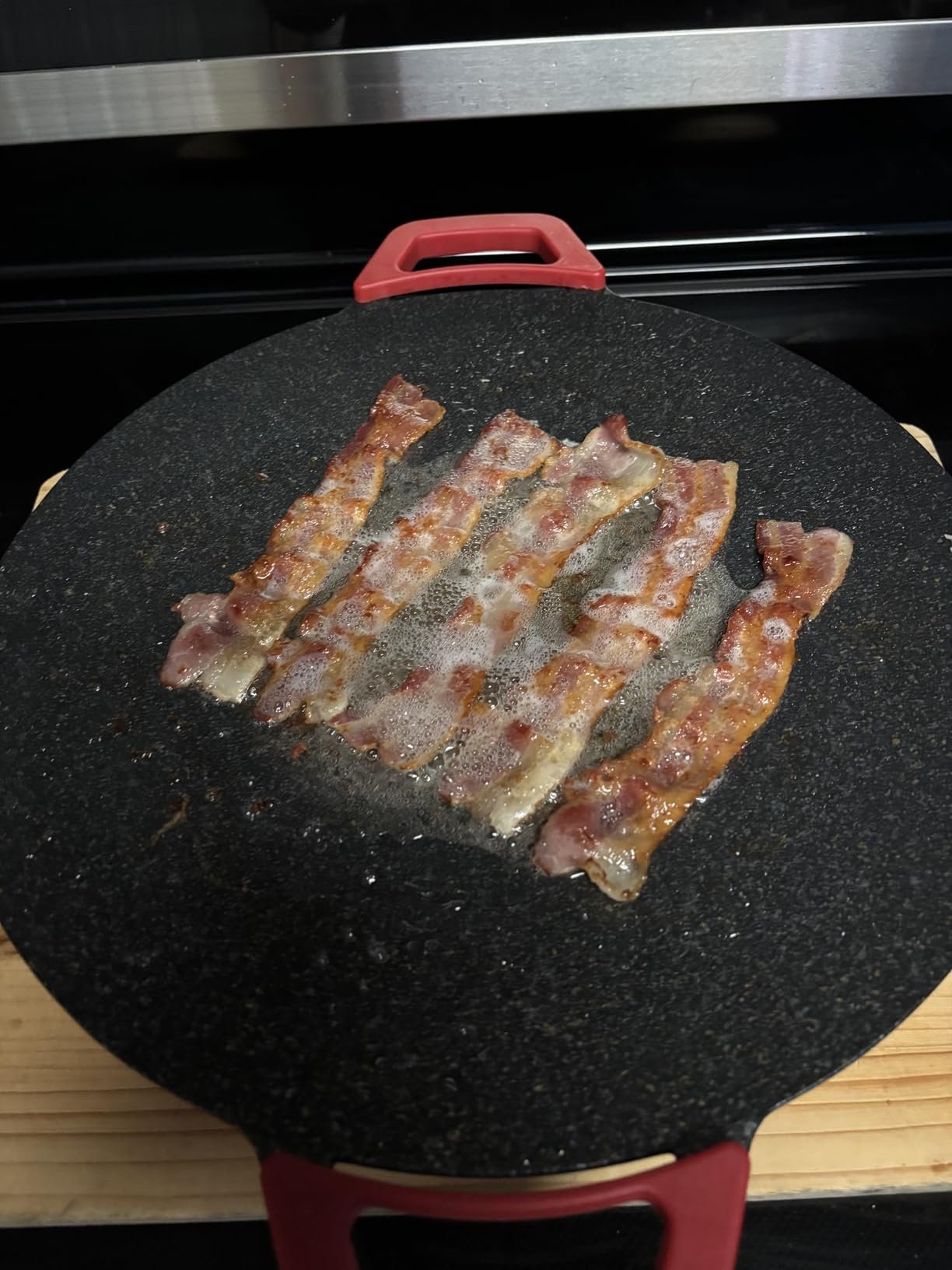 "Love this griddle! I made pancakes and eggs for the whole family this morning, and cleanup was a breeze. No smoke at all, even in my small apartment kitchen. Highly recommend!"